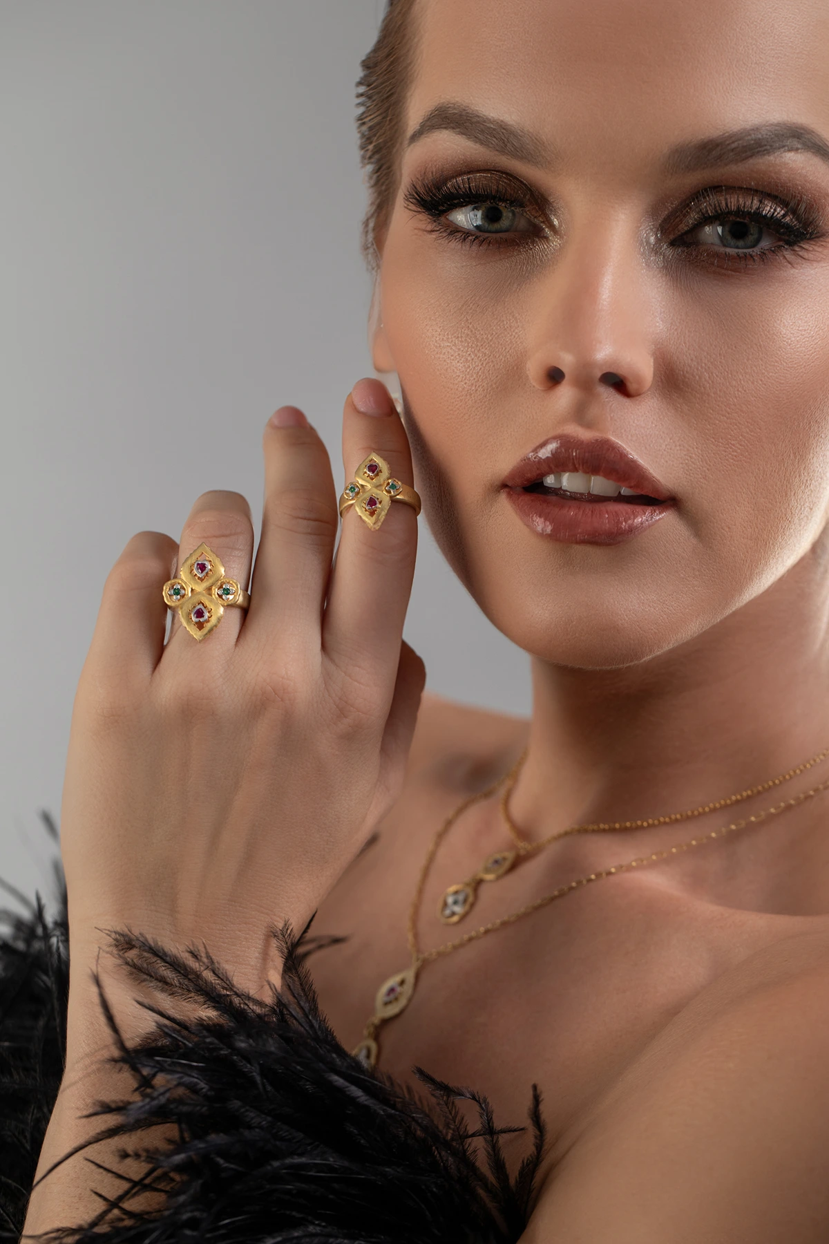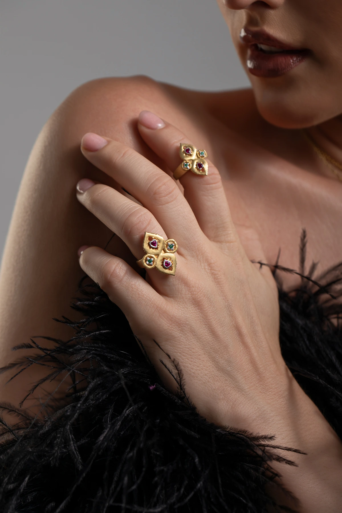 Omnia Collection : Omnia, a collection celebrating culture and heritage, combines heart-shaped rubies in fiery red with vibrant green round emeralds. Each piece radiates beauty and channels the gemstones' luck and positivity. Wearing Omnia symbolizes your roots, connecting you to your culture and heritage with significance and style.