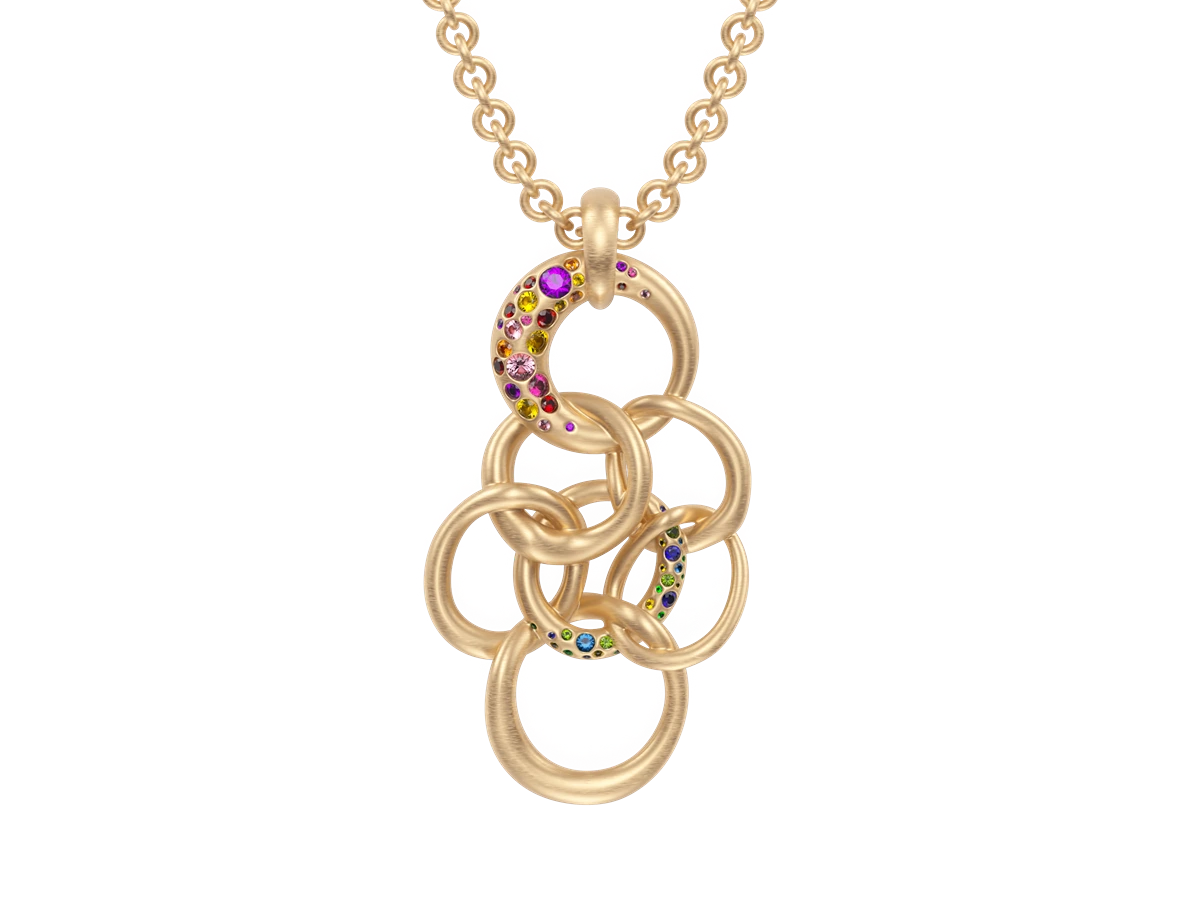 Ora Collection : Seven circles, symbolizing unity and positivity, adorned with the brilliant gemstones of the seven chakras: Ruby, Pink and Blue Sapphire, Purple Amethyst, Orange Garnet, Green Peridot, Green Emeralds, and Blue Topaz. Let the power of 7, the inherent positivity of circles, and the chakras' energy infuse your life with harmony, elevated energy, and a cascade of positive vibes.
